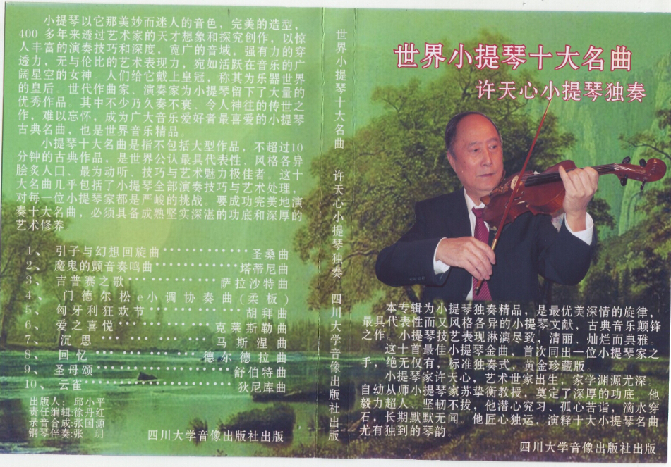 小提琴家许天心,艺术世家出生,家学渊源尤深。自幼从师小提琴家苏挚衡教授,正规系统学习,奠定了坚实深厚的功底。他毅力超人、坚忍不拔,长期默默无闻。他潜心究习、孤心苦诣,滴水穿石,炼就了惊世真功。其颤音技巧堪称一绝。他匠心独运,所奏十大小提琴名曲尤有独到的琴韵。